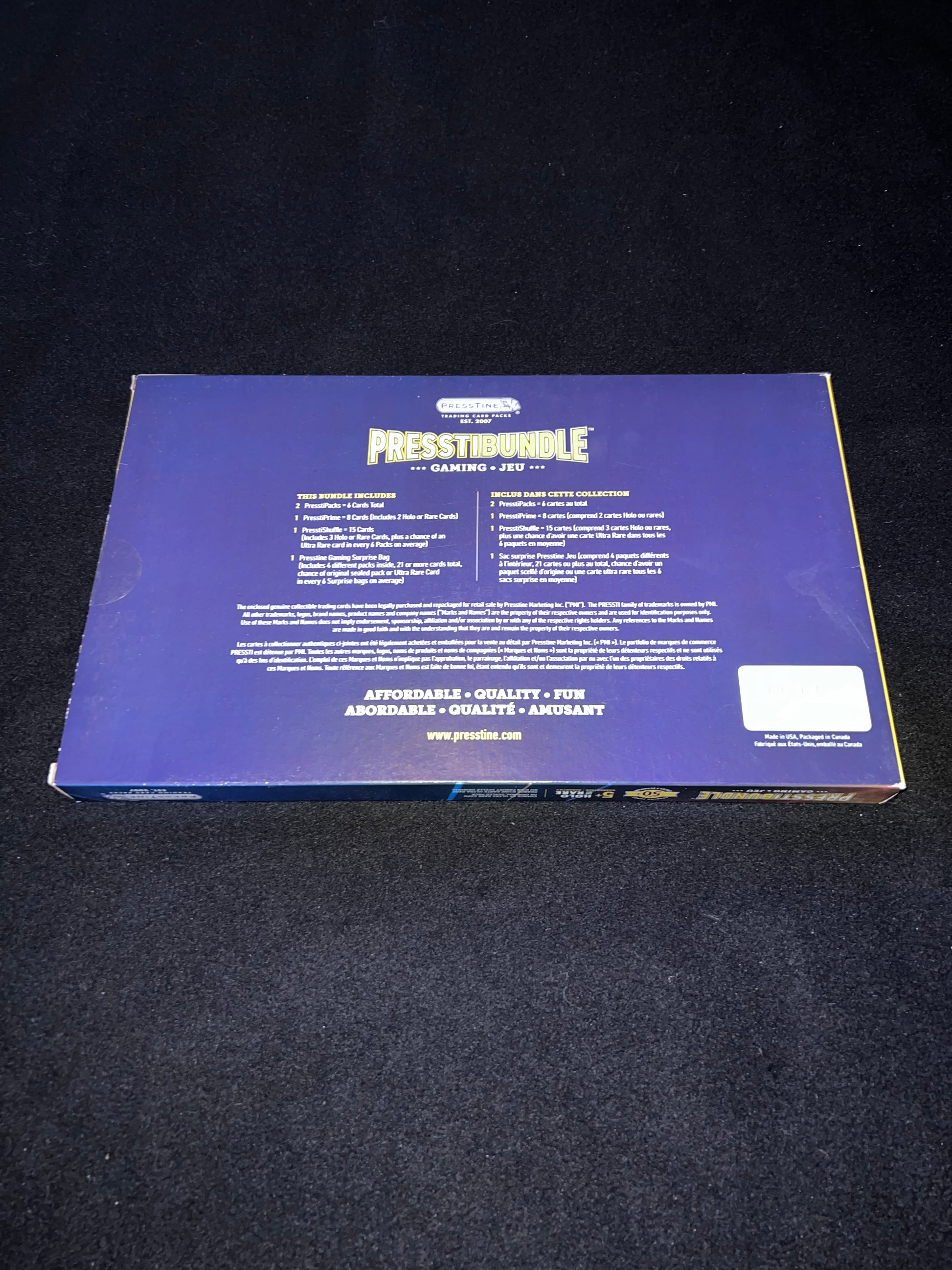 Each box contains 4 Pressti Packs and 1 Gaming surprise bag. Two packs contains 6 cards, One pack contains 8 cards including 2 holograms or rare cards. Pressti Suffle pack contains 15 cards including 3 hologram or rare cards, plus a chance in every 6 packs on average 1 ultra rare card. Gaming Surprise bag includes 4 different packs inside, 21 or more cards total, chance of orginal sealed gaming pack or Ultra Rare card in every 6 Surprise bags on average.